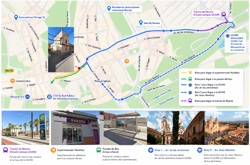 La zona también cuenta con supermercados, comercios, zonas de ocio y todos los servicios necesarios para el día a día, lo que incrementa aún más el atractivo de la inversión. En el mapa que se presenta a continuación se puede apreciar claramente la excelente ubicación del inmueble y su proximidad a la Universidad Católica San Antonio de Murcia (UCAM), así como a los principales puntos de interés de la zona.
